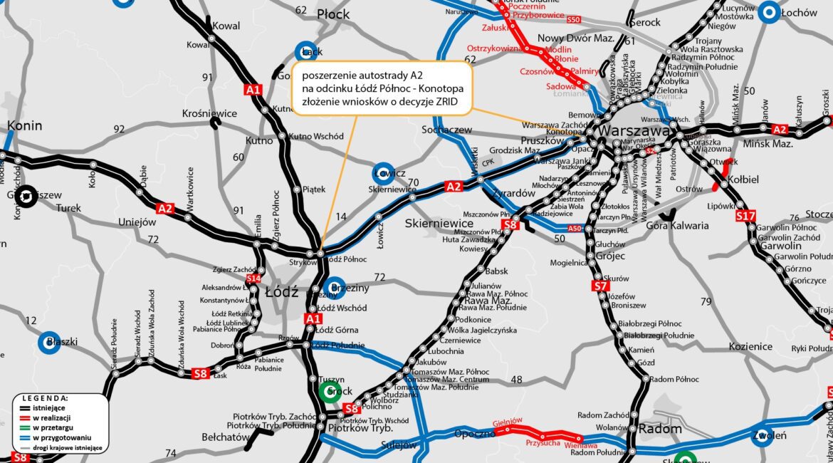 Generalna Dyrekcja Dróg Krajowych i Autostrad (GDDKiA) złożyła wnioski o wydanie decyzji ZRID do wojewodów łódzkiego i mazowieckiego, co otwiera drogę do poszerzenia autostrady A2 między Łodzią a Warszawą o dodatkowe pasy ruchu. Docelowo odcinek ten będzie liczył trzy pasy w obu kierunkach na trasie Łódź Północ – Pruszków oraz cztery pasy od Pruszkowa do Konotopy. Po uzyskaniu decyzji ZRID, przetargi na rozbudowę zostaną ogłoszone już w przyszłym roku.
